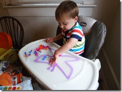Yesterday we made a butterfly with contact paper and ribbon! He was totally into it, thought the contact paper was funny how it was sticky and his hands kept getting “stuck!!!”. It did however only last about 4 minutes. LOL! But he made it and then I hung it up on the window right next to his high chair in the hopes it will get him excited to do more crafts.